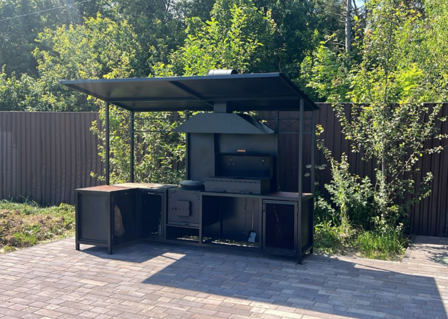 В комплекте: каркас, жаровня, кочерга, совок, подвес для казана, дымоход, колосники, печь под казан, зонт, мойка